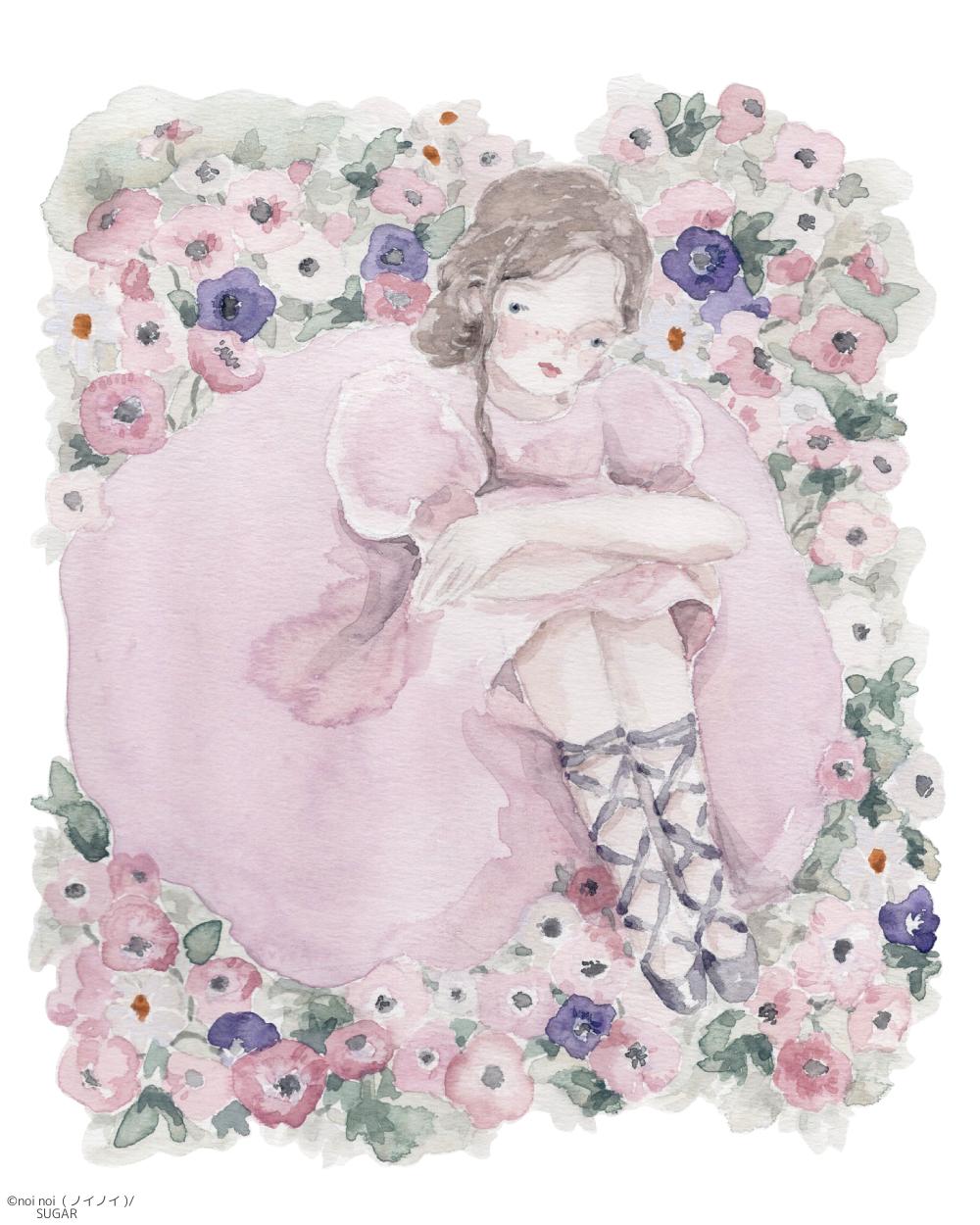 ”春待つわたし” アネモネ畑に佇む女の子の、一足早く春を感じられるイラスト。