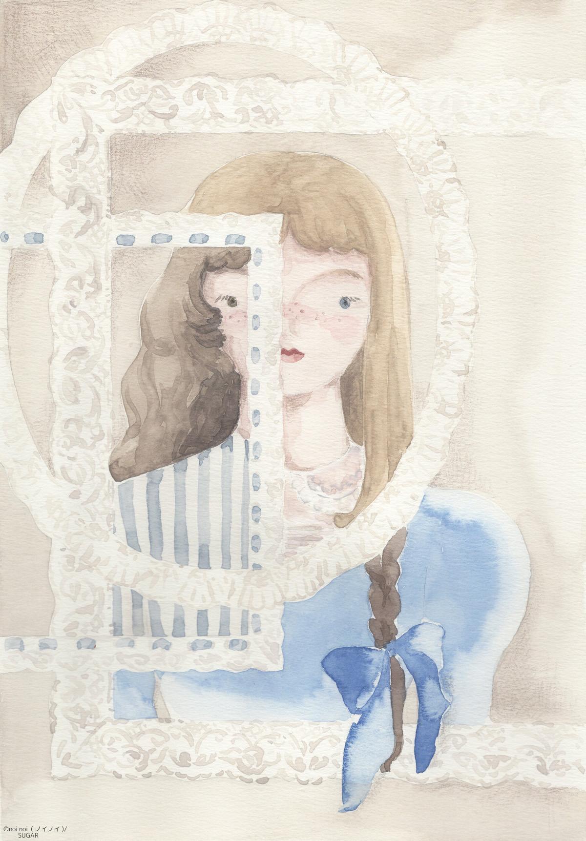 "いつかのわたし" 異なる装い、異なる髪型のわたしがレースのフレームの向こうで静かに重なり合うイラスト。 物語のあるイラストを水彩で描いています。