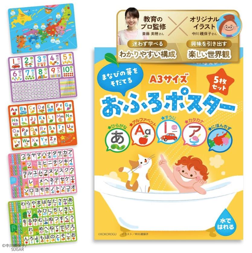 モンテッソーリトレーナー監修、アマゾンで販売中の幼児向けお風呂ポスターです。ひらがな・カタカナ・アルファベット・すうじ・日本地図のスーパーユポ紙5枚セット。イラスト、デザインレイアウトを担当いたしました。