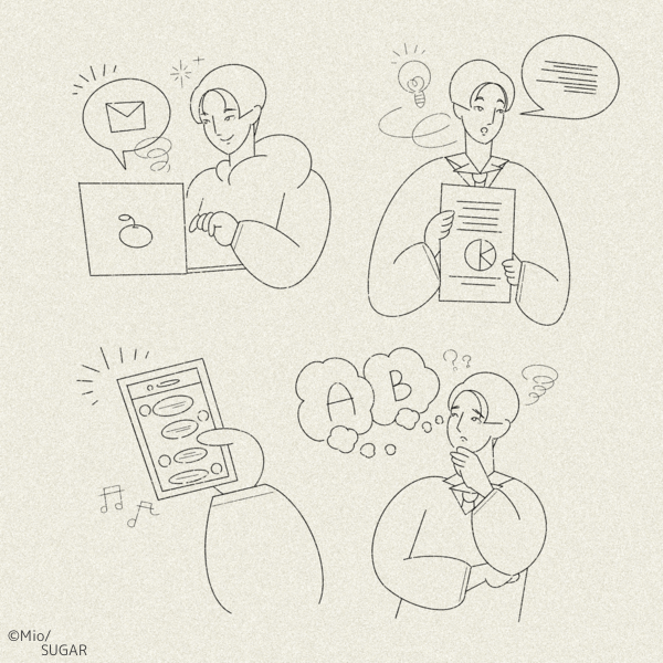 日常の業務や思考の流れを、やわらかな線で表現したカットイラスト。 サービス紹介や記事挿絵など、幅広い媒体で使いやすい汎用性を意識しています。