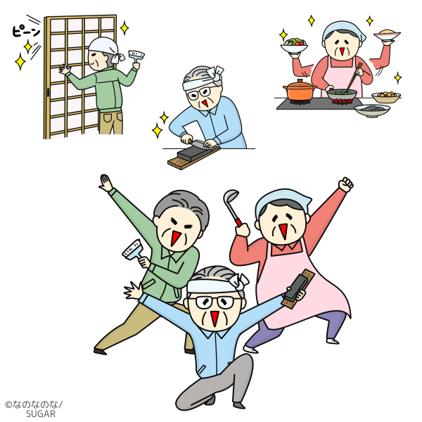 自治体広報誌 イラスト制作 戦隊ヒーローのようなポーズで生き生きとしたシニア世代を表現しました。