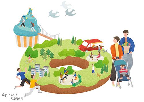 春の陽気に桜の木に集まる人々。様々な年代の方が春を楽しむ様子を描きました。