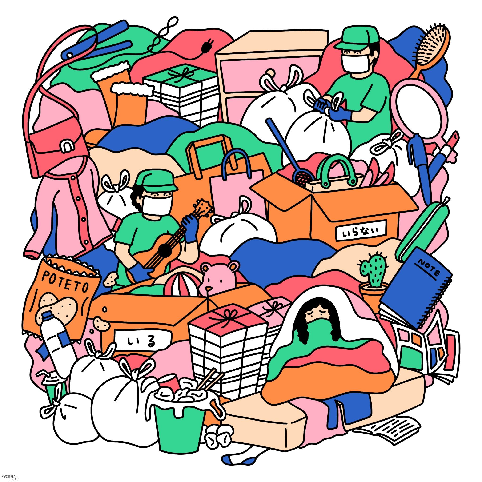 断捨離・大掃除をテーマに人や物がギュッと詰まった賑やかなイラストを目指しました。 フリーハンドで親しみやすいテイストを意識しました。