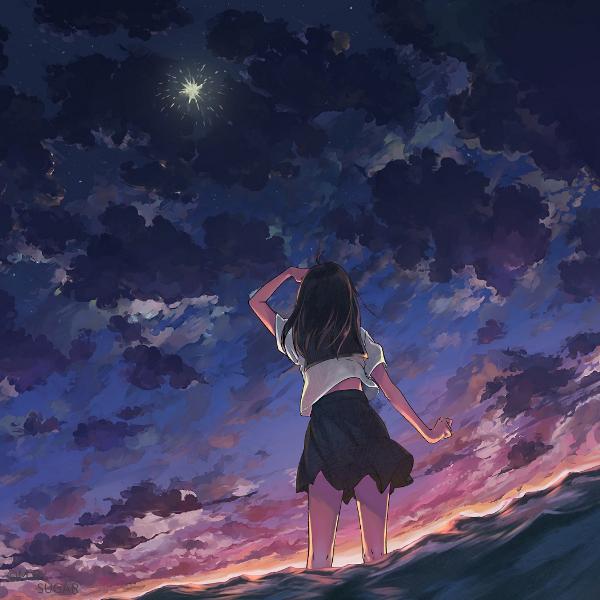 めありー「彼はきっと魔法を使う。」 ジャケットイラスト制作 リアル目なタッチの中に、星や雲の表現の仕方、キャラクターのポーズなどでどこかカジュアルでポップな雰囲気を演出しました。