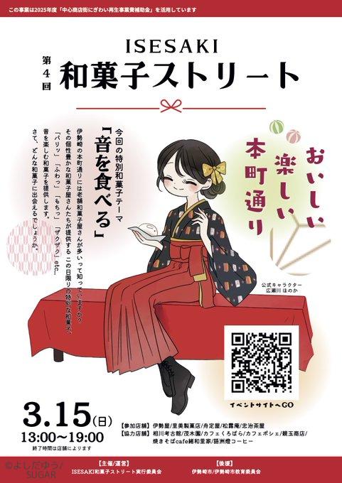 群馬県伊勢崎市 3/15(日)に開催されました、 第4回「ISESAKI和菓子ストリート」の イベント用キャラクターデザイン&立ち絵イラスト制作をさせていただきました。 ・画像のキャラクターイラスト部分を担当 他にも和服姿の女性キャラクター10点ほど制作