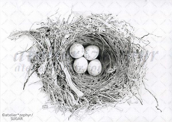 嵐の後、落ちてしまったヒヨドリの巣をスケッチ・写真撮影し、それらを元に鉛筆で描いた細密画です