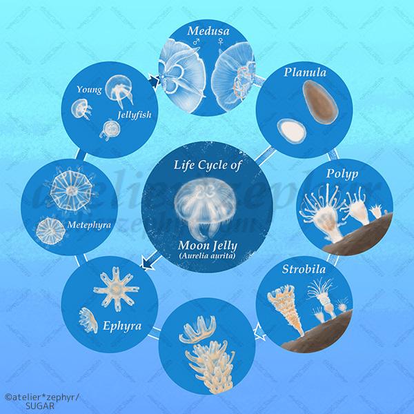 ミズクラゲの生活史を図にしたものです Adobe Fresco および Photoshop使用