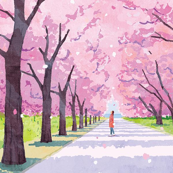 表紙やカレンダーを想定して描いた、桜並木を描いた春の風景イラストです。