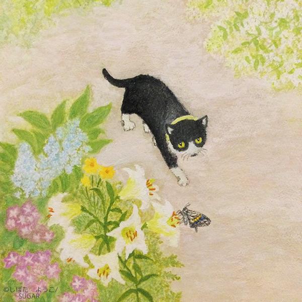 庭の黒猫と花にとまったアゲハ蝶を水彩絵の具で制作