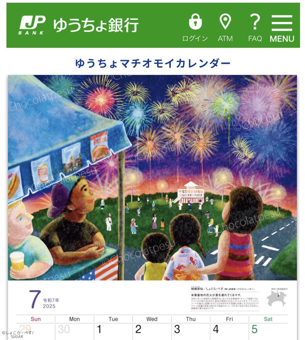 【Works】ゆうちょ銀行さま「カレンダー2025」 【ゆうちょマチオモイカレンダー2025】 7月を担当しました。育った町、相模原市にある「キャンプ座間」の花火です。 (デジタル制作)2024年 #夏 #夜 #祭り #浴衣 #花火 #お盆 #挿絵 #カレンダー #家族 #夏休み