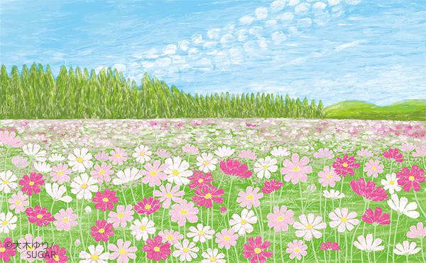 「秋のひととき、コスモス畑」 秋風にそよぐコスモスの花々を描きました。やわらかな色合いと風に揺れる姿が、どこか懐かしく、心を穏やかにしてくれます。季節の移ろいを感じながら、秋のひとときをそっと彩る風景をお楽しみください。