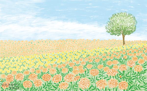 「陽だまりに咲く、マリーゴールド」 やわらかな陽ざしに包まれて、咲き誇るマリーゴールド。 一本の木が見守る、どこか懐かしくて、あたたかな風景を描きました。