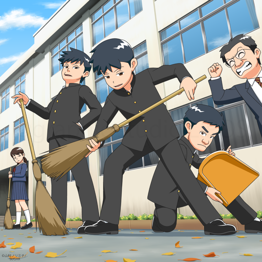 学校の掃除時間、中庭で清掃を任された男子生徒3人…のはずが、彼らは掃除道具を武器や防具に見立ててゲームやアニメのキャラクターになりきり、真剣な表情でふざけている様子。 …そんな男子中学生らしい「あるある」の一瞬を切り取りました。 そんな彼らをシラけた目で遠巻きに眺める女子生徒と、情けなさを感じながら注意を飛ばす先生のコントラストが生むおかしさを意識して作画しました。