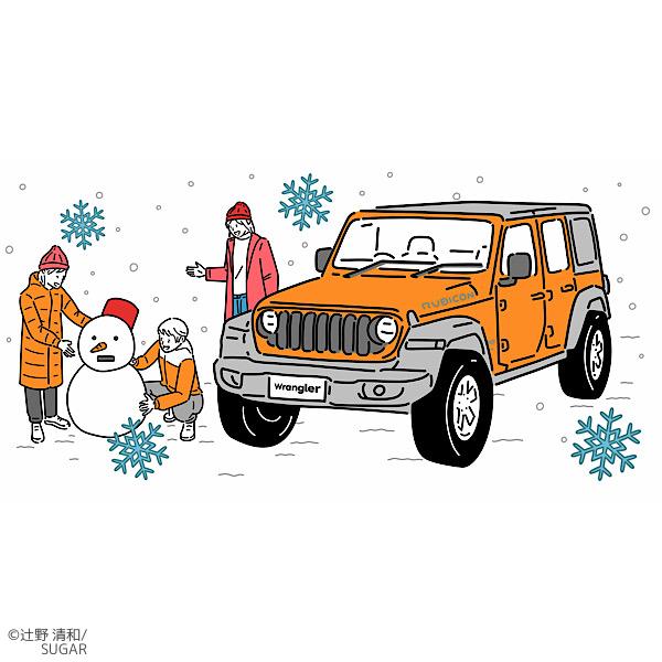 冬、不意に降り出した雪を楽しむ人たちを描きました。