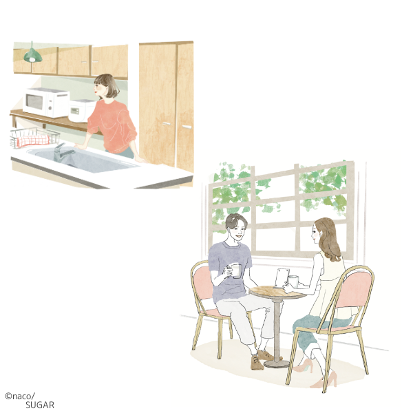 ライフスタイル関連の記事やコラムの挿絵を想定して制作しました。 優しい色合いとわかりやすい構図で、見た人にわかりやすく状況を説明します。 パースの付いた背景や複数人数の描画も得意です。