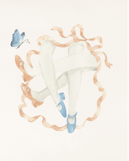 ワルツを踊る2人のカットイラスト。 浮き立つ足元と蝶でやわらかい春の訪れを表現しました。