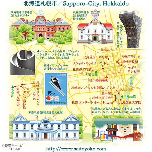 【北海道札幌市イラストマップ】 読売新聞日曜版「名言巡礼」連載-第282回/新聞連載の旅行記事に、観光情報として掲載されました。 イラストマップ イラストルポ 絵地図 観光マップ 観光案内 観光ガイド 国内旅行 建築物 建造物 建物 たてもの 教育 教材 教養 トラベルガイド お土産 おみやげ 遺産 遺跡 史跡 文化財 社会 歴史 郷土 地方 お城 電車 鉄道 乗り物 のりもの