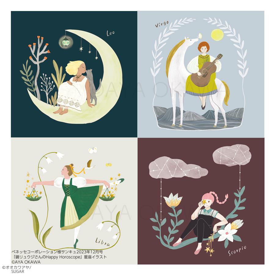 株式会社ベネッセコーポレーション様サンキュ!2023年12月号「〈保存版〉2024 鏡リュウジさんの Happy Horoscope」にて、 星座占いイラスト12ヶ月分を描きました。 星座を大人可愛い女性にして、配色の並びに気を付けて仕上げました。