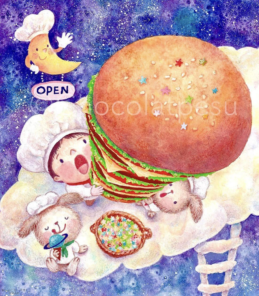 【Original】「さぁ、開店だ!」 所属している、こどもの本に絵を描く職業画家の団体【童美連】の 創立60周年記念作品集「WHO’S WHO」に掲載されています。 (アナログ制作)2025年 #空 #夜 #星座 #星空 #宇宙 #食べ物 #こども #うさぎ #絵本 #ファンタジー