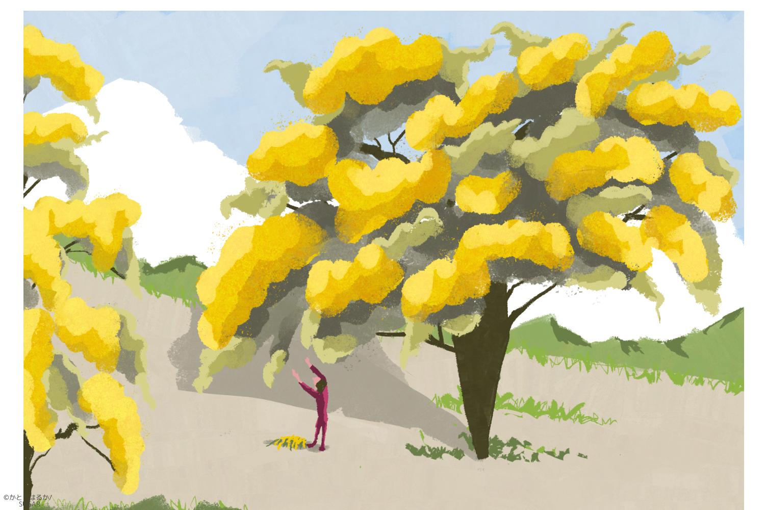 春の陽気に桜の木に集まる人々。様々な年代の方が春を楽しむ様子を描きました。