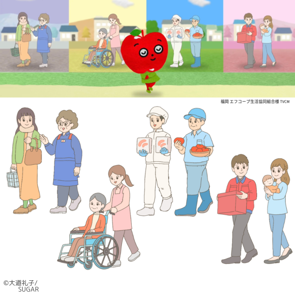 (株)DLE様のご依頼いただき、福岡の生協「エフコープ」テレビCMの、背景のイラストデザイン(人物たち・建物等)を作成させていただきました(※手前の公式キャラクター「えふりん🍎」はちがいます)