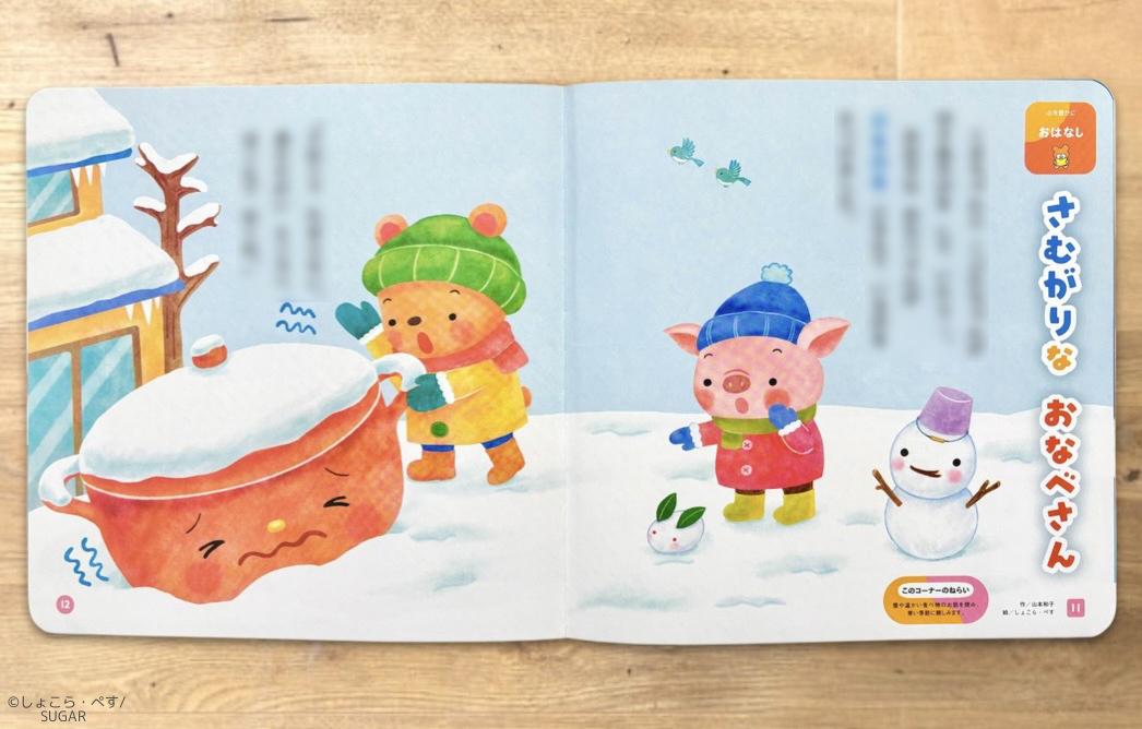 【Works】月刊保育絵本 がっけんつながるえほん『できた』2月号おはなし (株)GakkenSEED様 2026年「さむがりな おなべさん」挿絵(5見開きページ) (デジタル制作)