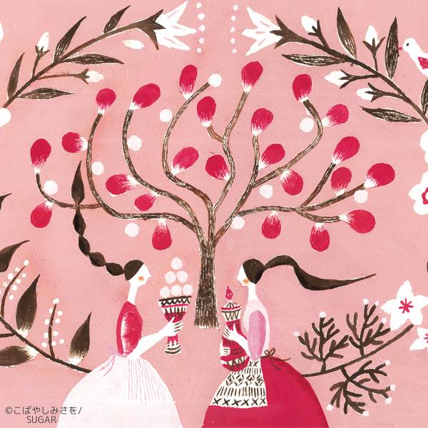 不二家100周年記念ケーキのパッケージデザインイラストの一部です。クリスマスケーキの華やかなイメージでプレゼントを想起するリボン、お祝いのイメージのバラ、植物を組み合わせました。