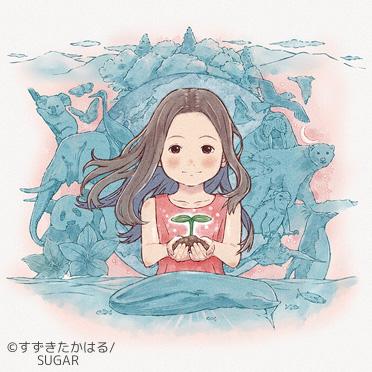 アースデイin佐久2025のチラシ用に制作しました。イベントのテーマは「めぐる、つながる、うまれる」。中央の少女の手には新芽。背景には、絶滅危惧種に指定されている動物、植物、地球を描きました。
