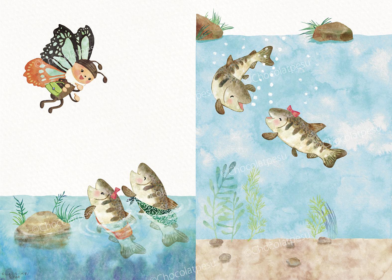 子供たちと猫たちがお魚いっぱいの海を冒険するイラストを制作しました。