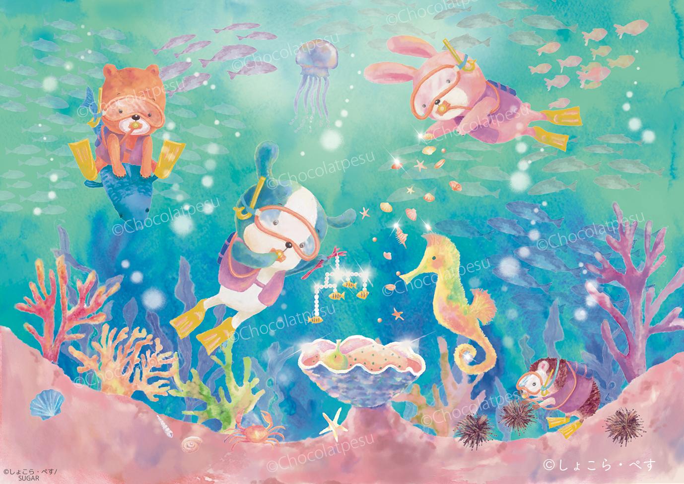 【Original】「赤ちゃんがうまれたよ」 貝殻のゆりかごで眠るタツノオトシゴの赤ちゃん。みんなでお祝いにかけつけたよ。 (デジタル画) #こども #赤ちゃん #海 #動物 #犬 #うさぎ #ハリネズミ #くま #カレンダー #夏