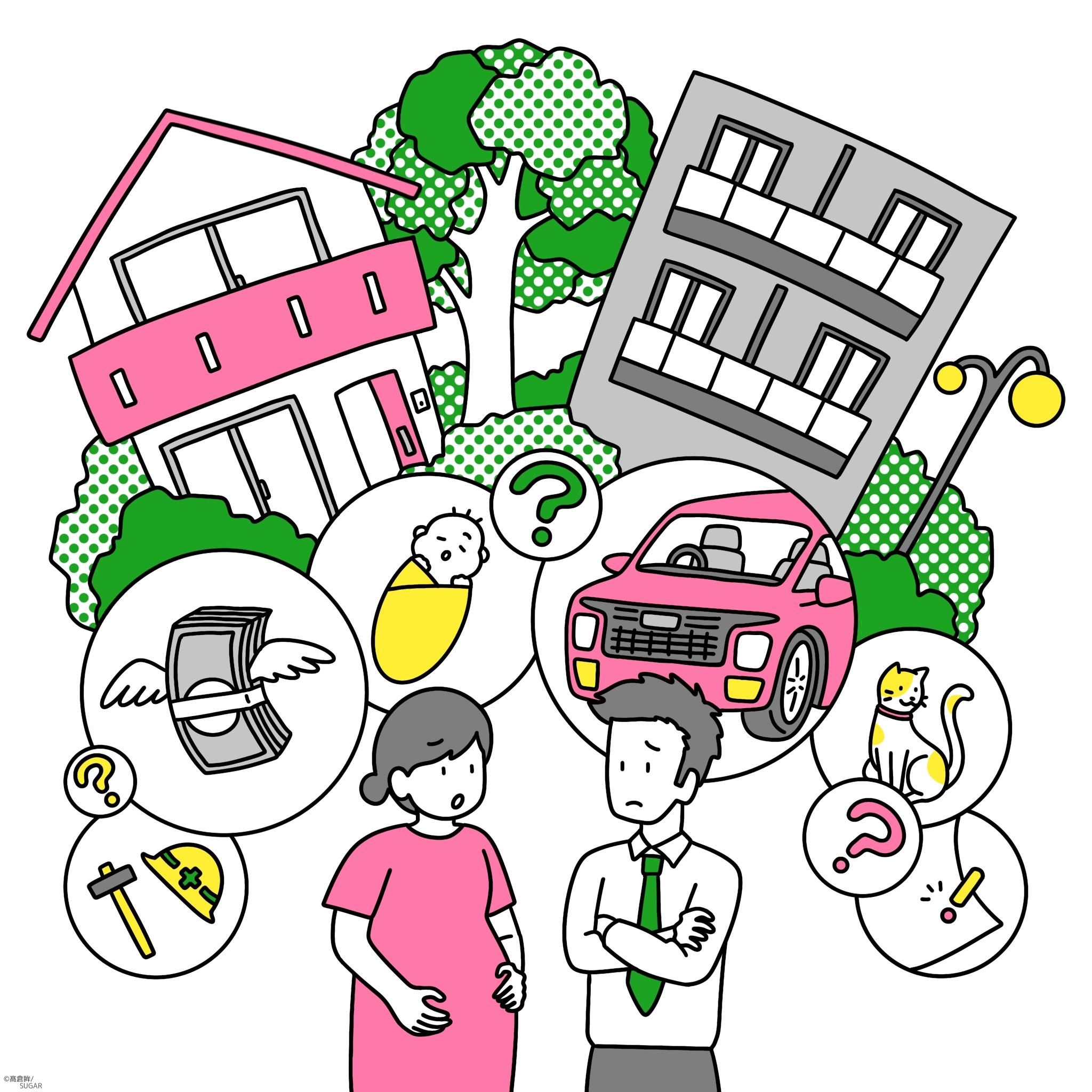 戸建かマンションか、どちらを購入しようか検討している夫婦をイメージしたイラストです。