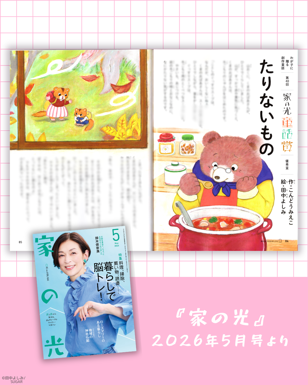 \✏️WORK《お仕事》🎨/ 4月1日発売 『家の光』2026年5月号 「わが子に贈る創作童話」 第40回 家の光童話賞・優秀賞作品の 絵を担当しました。 「たりないもの」 作:こんどうみえこ 絵:田中よしみ あたたかい物語に関わらせていただき、 とても嬉しいお仕事でした☺️ 貴重な経験となりました。 これからも、こうしたお仕事に 携わっていけたら嬉しいです✨ #家の光 #挿絵 #絵本 #児童書 #童話