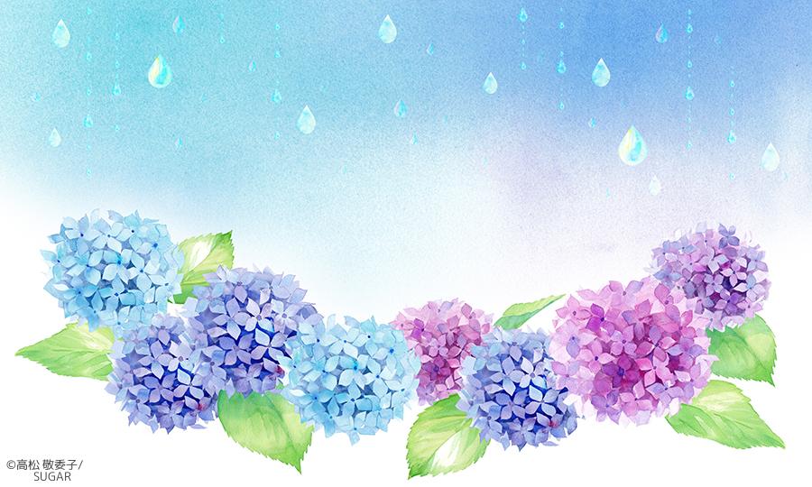 梅雨時期のイメージバナー背景に。 紫陽花と雨の水彩イラスト。
