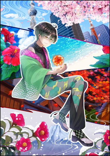 和風テイストのキャラクターと、日本の四季をイメージした背景を描いた作品です。