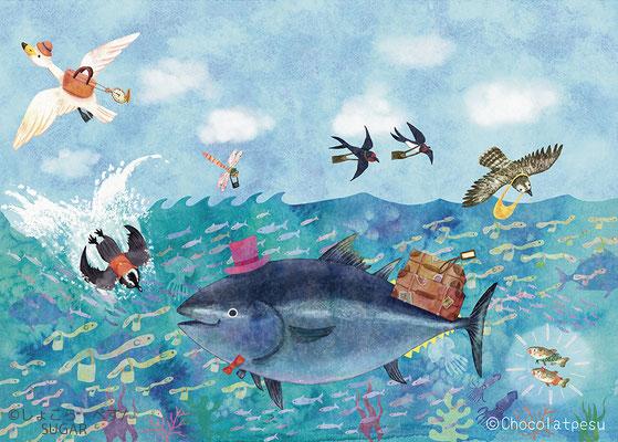 DHC 「みんなげんき」 2025.10月号 表紙のイラストを担当しました。 マグロを墨絵のようにダイナミックに描いています。