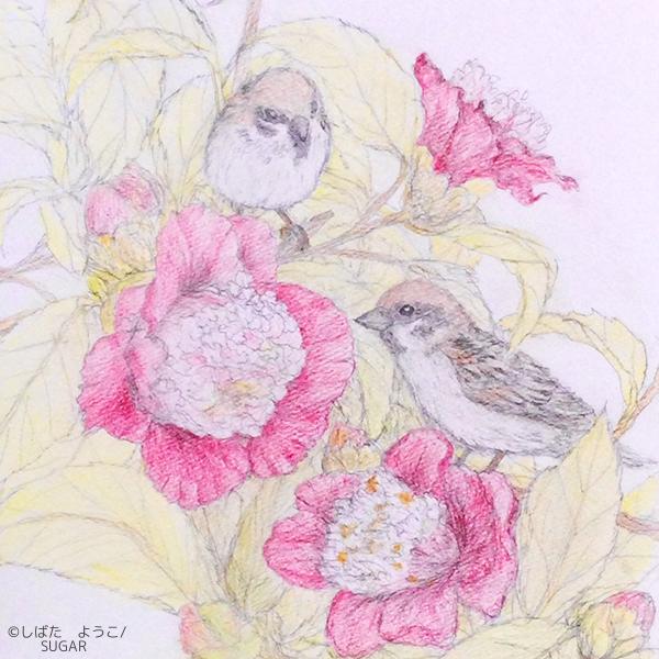 椿の鉛筆スケッチに雀を追加し賑やかな春の朝を表現