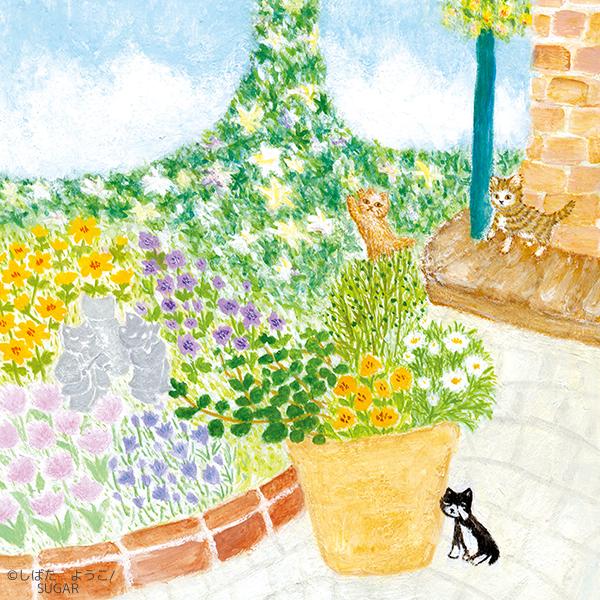 猫たちが庭でくつろぐようすをラブリーにアクリルガッシュで制作