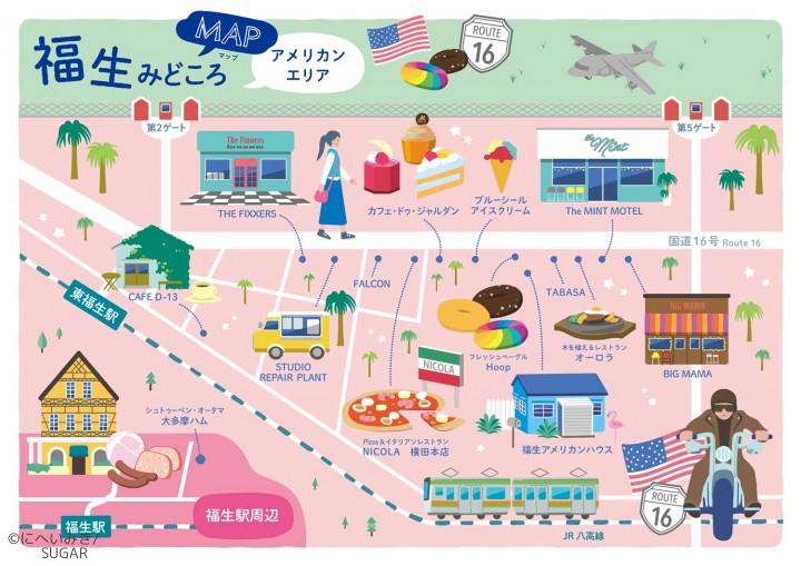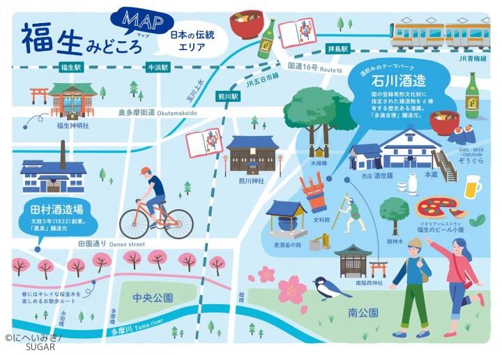 東京都福生市の酒蔵 石川酒造の「福生の観光巡り」特設ページ内のMAPイラストを担当しました。