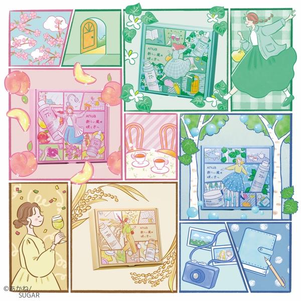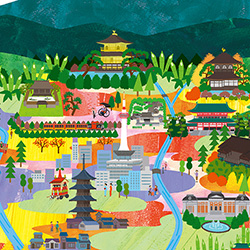 昨年春に熊本県・花畑広場で開催されたスタンプラリーのスタンプ原画を制作しました。熊本城、阿蘇山、桜をモチーフに描いた風景イラストです。スタンプとして使用されることで、インクのかすれやアナログ感が加わり、温かみのある仕上がりになりました。以前訪れた阿蘇山や熊本城の風景を思い出しながら制作しています。くまモンとの共演は、カゴメ野菜生活季節限定シリーズ「熊本県デコポンミックス」以来でした。