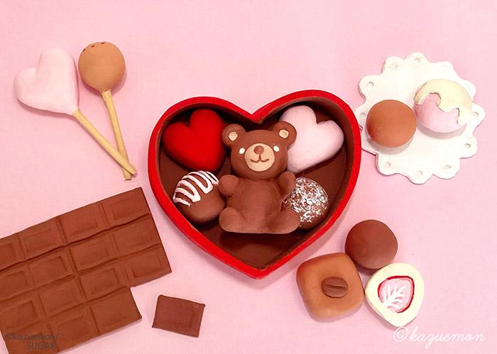 粘土でバレンタインのチョコレートとくまの立体作品を作りました。