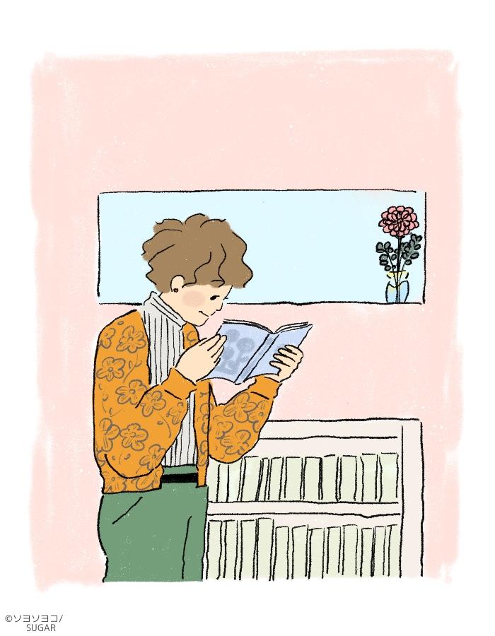 女性が読書をしている場面です。 少しだけ読むつもりが、思わず没頭している様子を描いています。