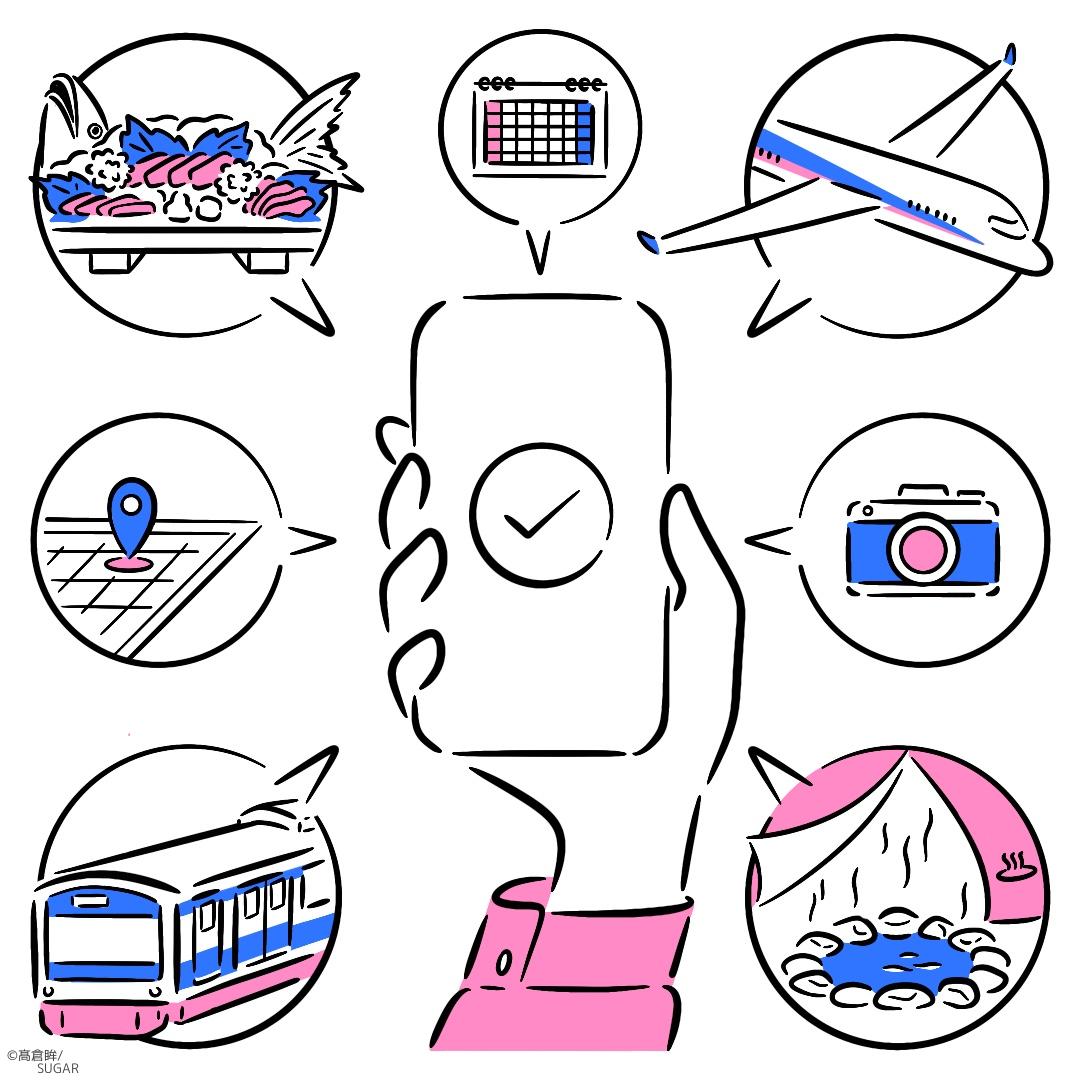 旅行で欠かせない下調べや予約をイメージしたイラストです。