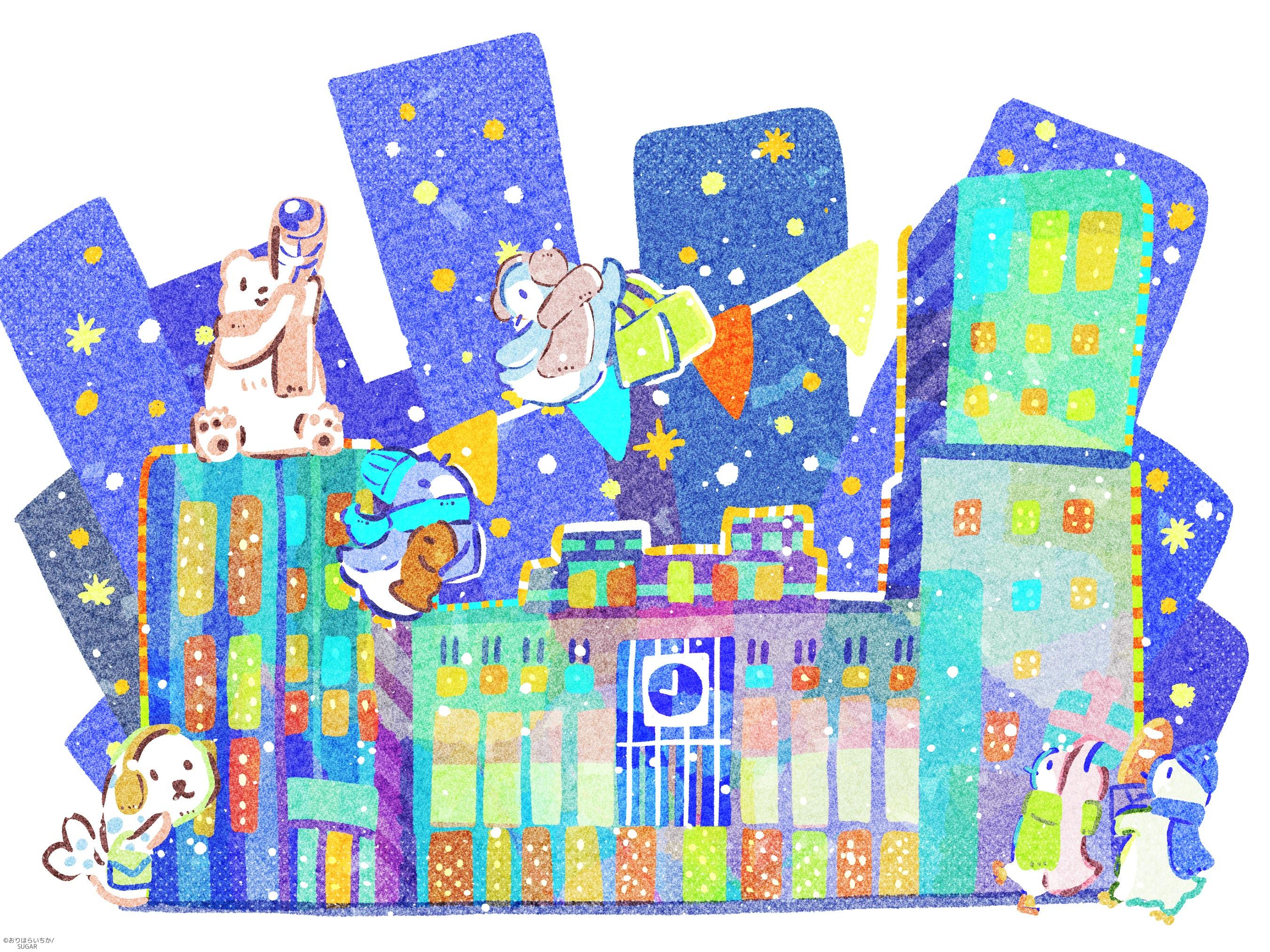 札幌駅とペンギン 冬の札幌駅をポップに描きました。 ペンギンやアザラシといった生き物を合わせ、 冬らしさを表現しました。 2025年11月制作