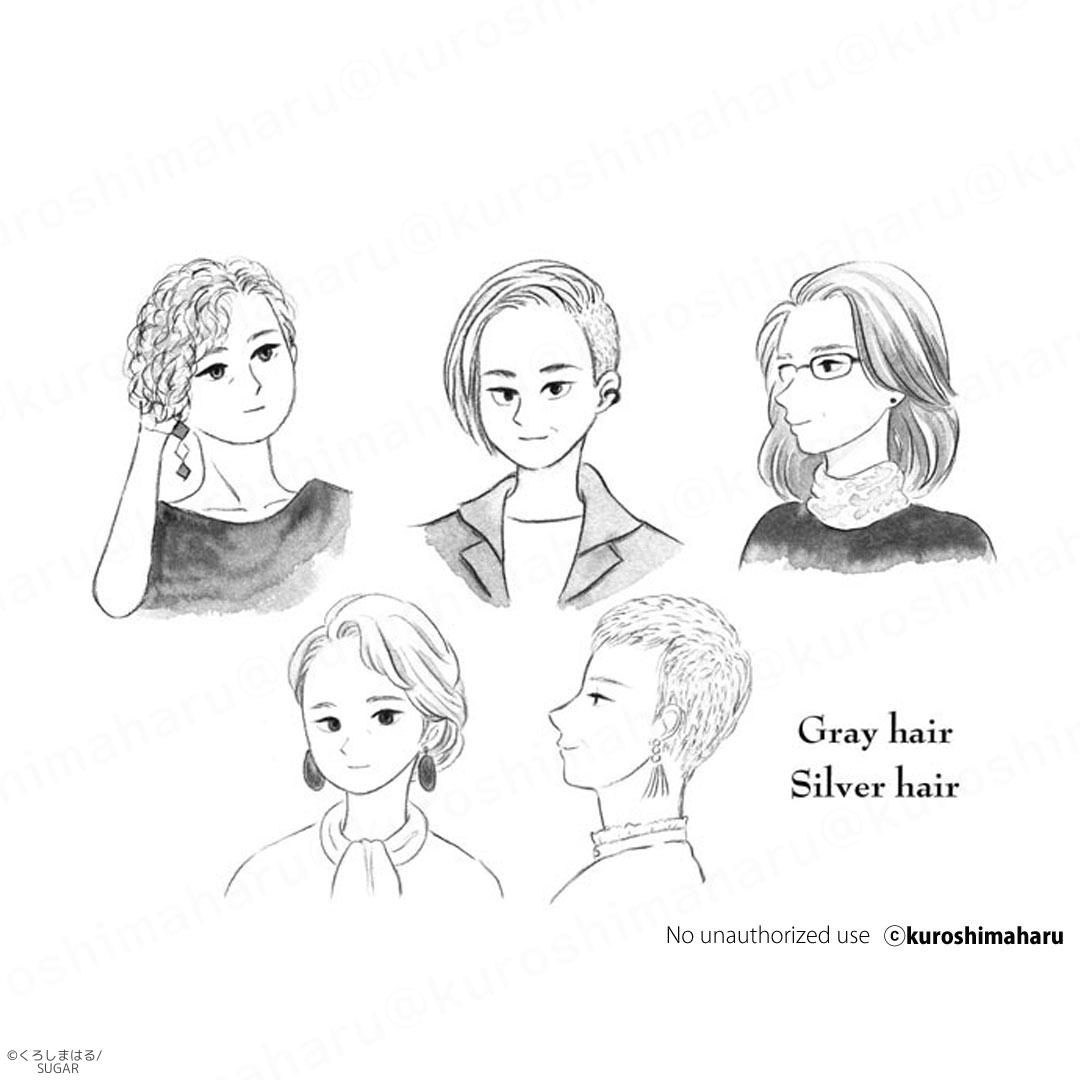 白黒カット習作「グレーヘアーの女性たち」 シルバーヘアーともいいますね。 大人のお洒落なヘアスタイルを色々描きました。