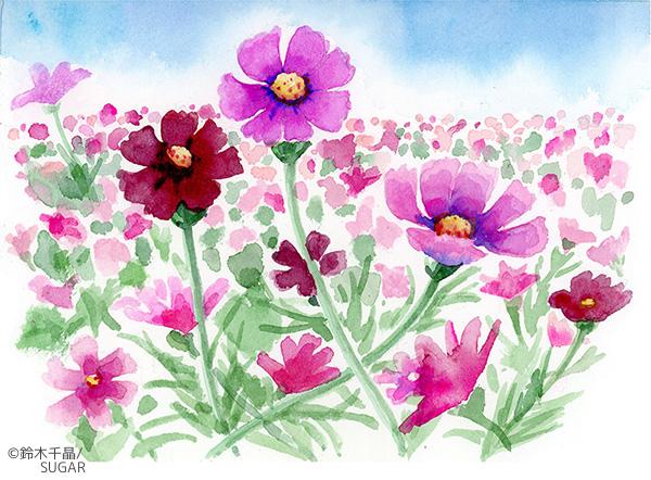 DHC 「みんなげんき」 2025.10月号 表紙内の原画です。 秋の風景、青空の下のコスモス畑です。