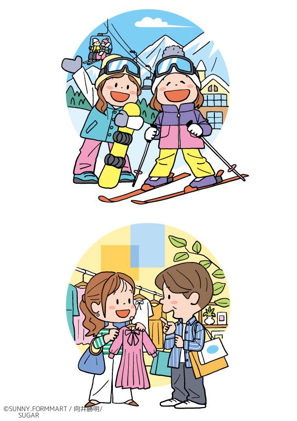 ショッピングセンターで過ごす人たちをテーマとしたカットイラストを描きました。