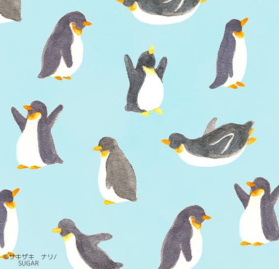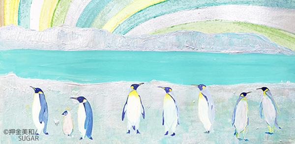 氷の世界で楽しく過ごすペンギンたちを描きました。
