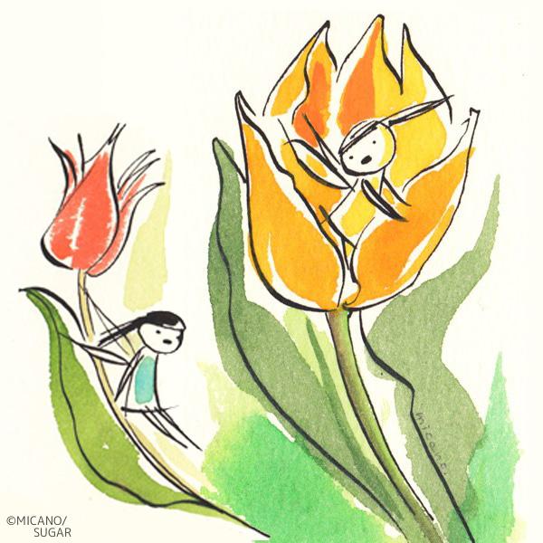 庭でお花に水やりをしている、ほのぼのとした場面を描きました。