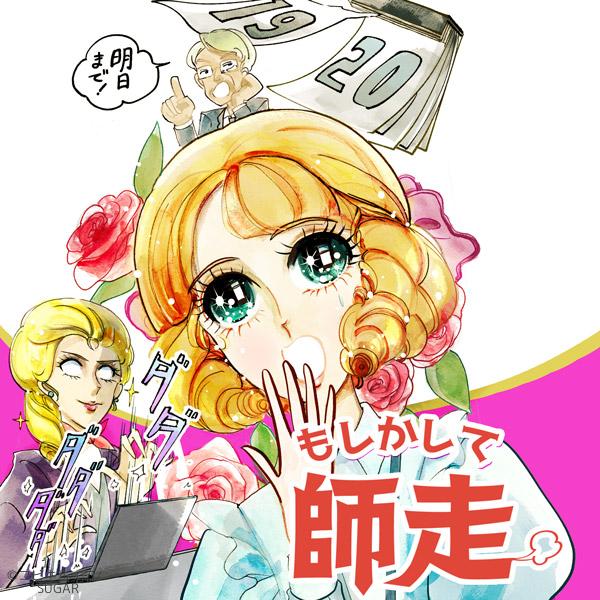 レトロ少女漫画タッチのイラスト。 気まぐれな上司とシゴデキな白目縦ロールの先輩にあたふた、12月に追われる働く女性をコミカルタッチで描きました。 水彩で作画し、Photoshop、CLIP STUDIOで仕上げ、ロゴはIllusutratorで制作。