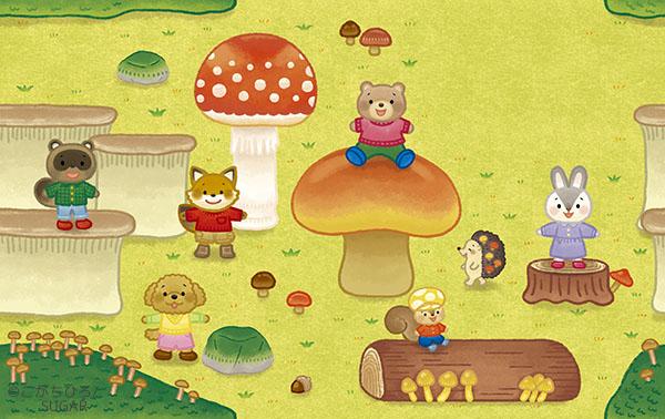 「ワンダーブック おしゃれきのこランド」 表現コーナーのイラストです。(世界文化ワンダーグループ)